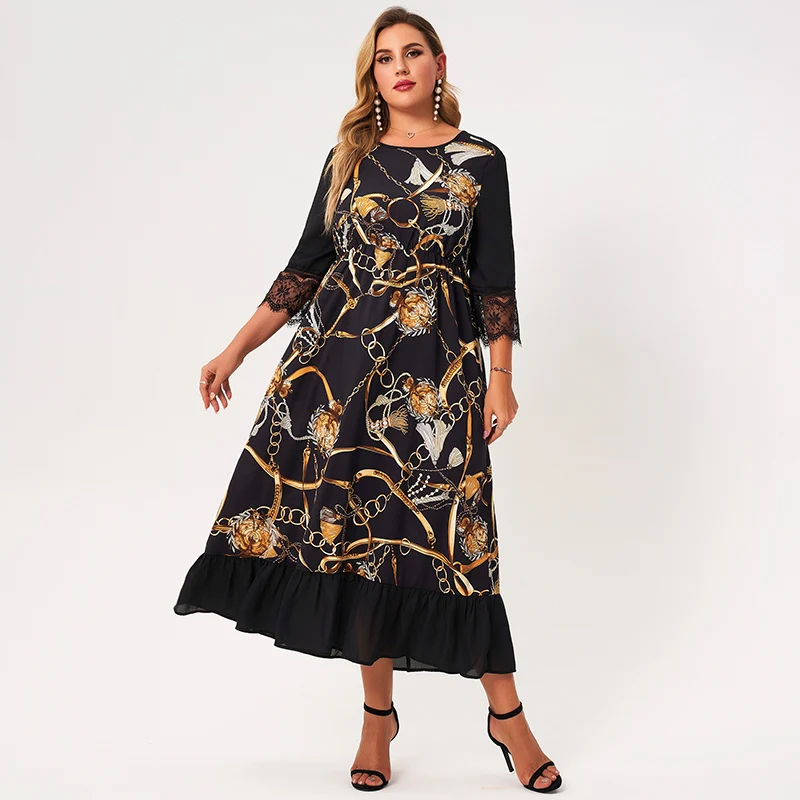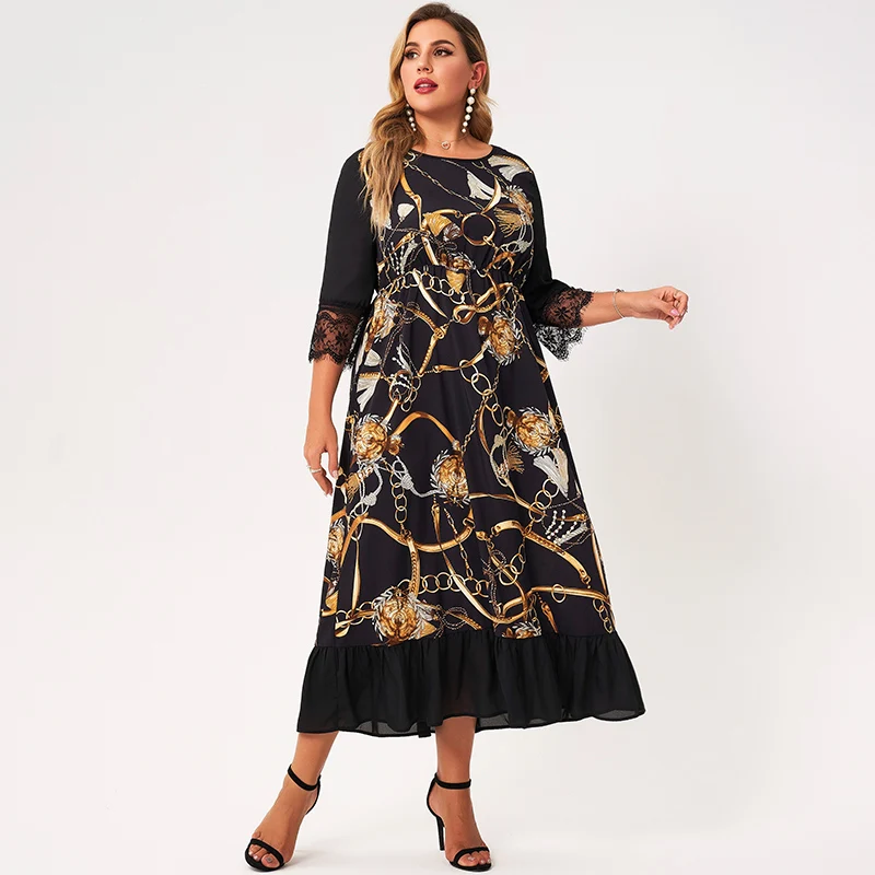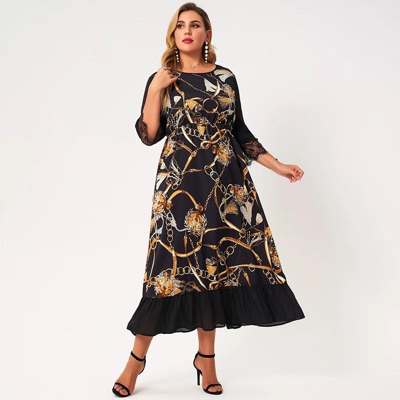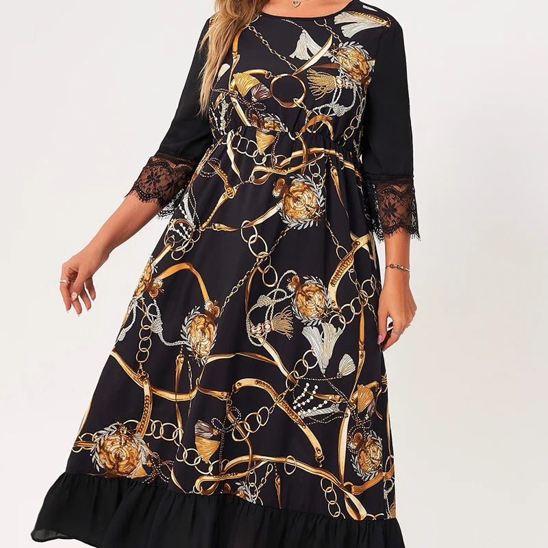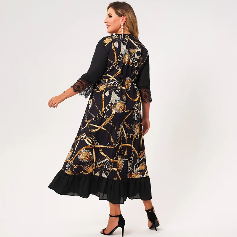 3/4 Sleeve Gold Chain Print Ruffle