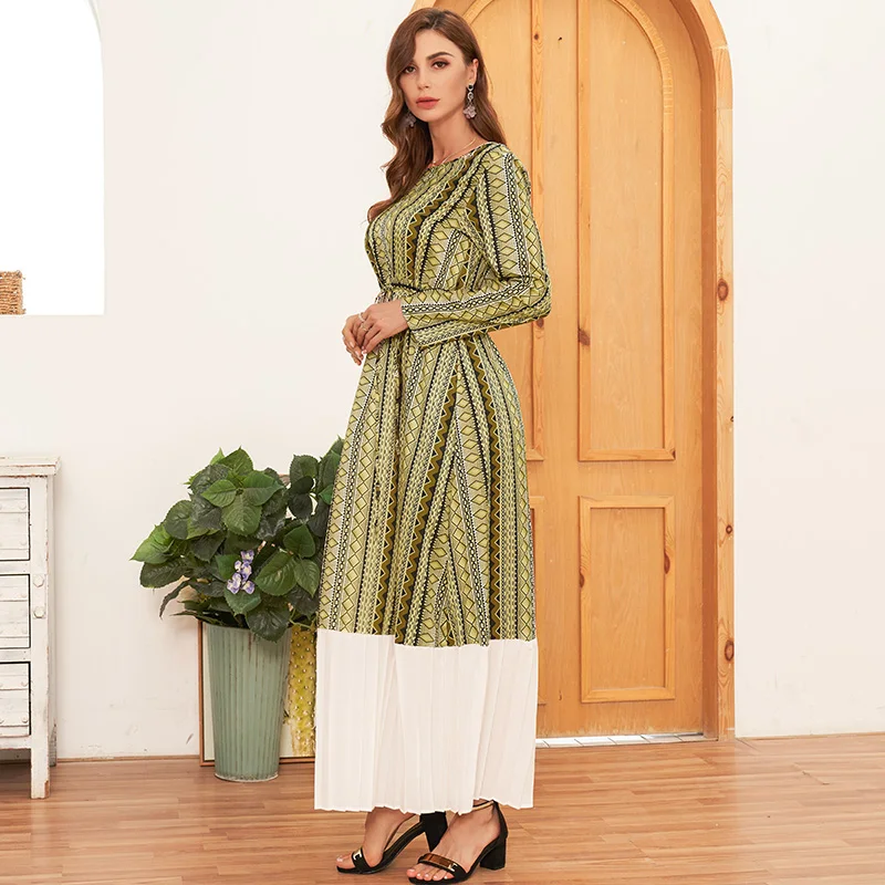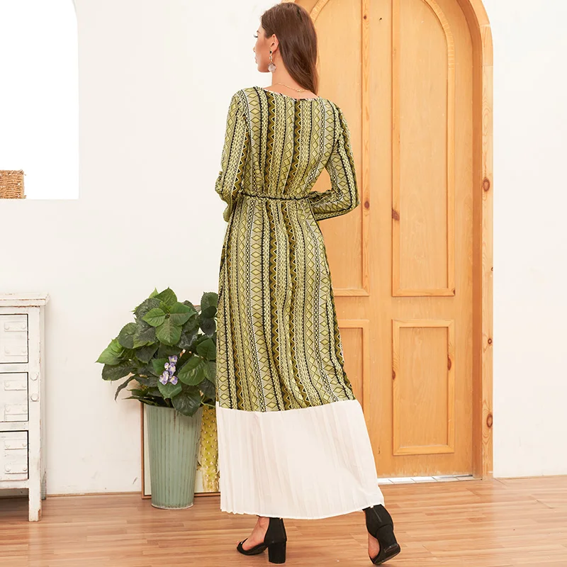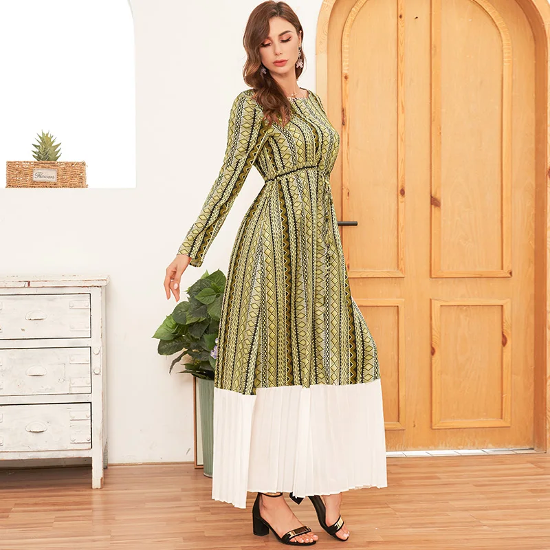 Retro print round neck long sleeve pleated stitching